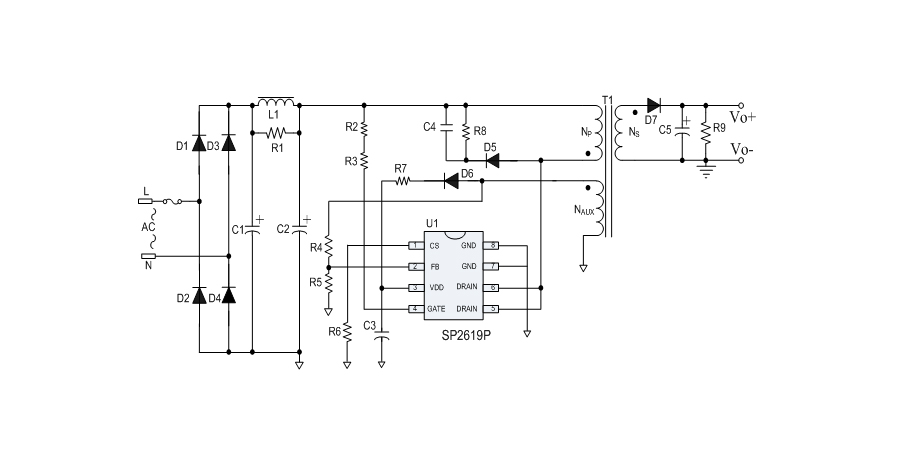SP2619P 提供全面的保護功能,包括逐周期限流保護(OCP)、VDD 過壓保護(OVP)、VDD 欠壓保護(UVLO)、反饋環(huán)路開路保護、輸出短路保護、輸出過壓保護、過溫保護等。其中,輸出短路保護、輸出過壓保護具有自動重啟恢復(fù)的功能。