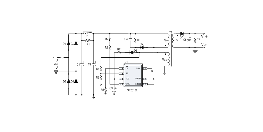 SP2618F是一款性能優(yōu)異的原邊反饋控制電路,應(yīng)用于小功率AC/DC充電器與適配器??刂齐娐肥褂迷叢蓸蛹夹g(shù)進行精確的恒流、恒壓控制,可以省去一般應(yīng)用中的光耦與TL431。