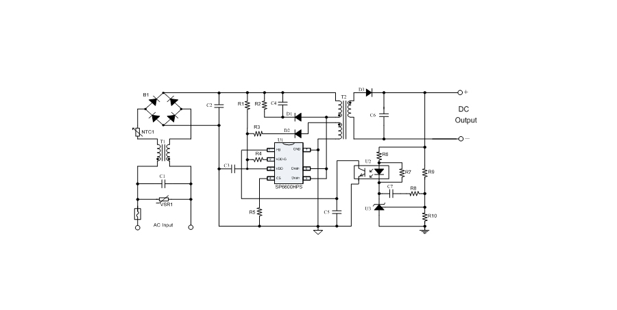 SP6600HPS在PWM模式下工作于固定頻率,這個頻率是由內(nèi)部精確設定的。在空載或者輕載時,工作頻率由IC內(nèi)部調(diào)整。芯片可以工作在綠色模式,以此來減小輕載時的損耗,提高整機的工作效率,SP6600HPS在啟動和工作時只需要很小的電流,可以在啟動電路中使用一個很大的電阻,以此來進一步減小待機時的功耗。芯片內(nèi)置有斜坡補償電路,當電路工作于大占空比時,避免次諧波振蕩的發(fā)生,改善系統(tǒng)的穩(wěn)定性。內(nèi)置有前沿消隱時(Leading-edge blanking time),消除緩沖網(wǎng)絡中的二極管反向恢復電流對電路的影響。SP6600HPS采用了抖頻技術,能夠有效改善系統(tǒng)的EMI性能。系統(tǒng)的跳頻頻率設置在音頻(20KHz)以上,在工作時可以避免系統(tǒng)產(chǎn)生噪音。SP6600HPS內(nèi)置多種保護,包括逐周期限流保護(OCP),過載保護(OLP),過壓保護(OVP),VDD過壓箝位,欠壓保護(UVLO),過溫保護(OTP)等,通過內(nèi)部的圖騰柱驅動結構可以更好的改善系統(tǒng)的EMI特性和開關的軟啟動控制。
