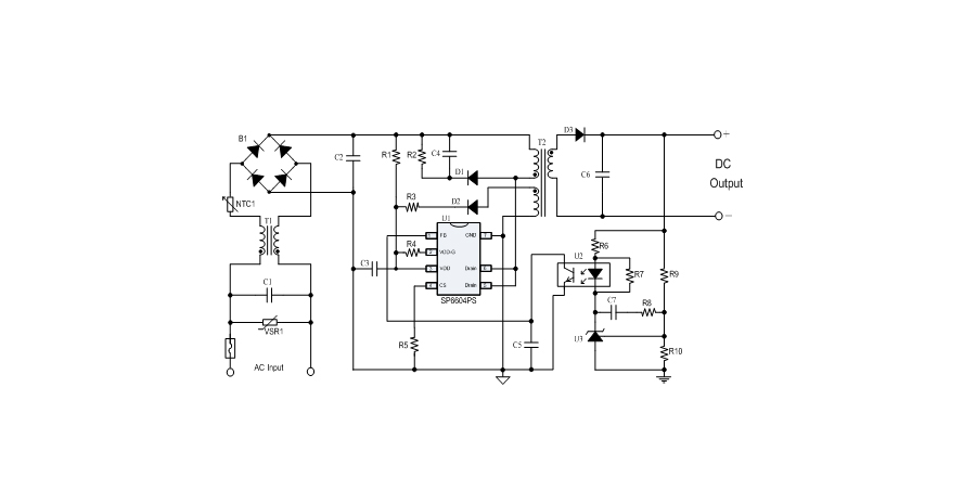 SP6604PS在PWM模式下工作于固定頻率,這個(gè)頻率是由內(nèi)部精確設(shè)定的。在空載或者輕載時(shí),工作頻率由IC內(nèi)部調(diào)整。芯片可以工作在綠色模式,以此來(lái)減小輕載時(shí)的損耗,提高整機(jī)的工作效率,SP6604PS在啟動(dòng)和工作時(shí)只需要很小的電流,可以在啟動(dòng)電路中使用一個(gè)很大的電阻,以此來(lái)進(jìn)一步減小待機(jī)時(shí)的功耗。芯片內(nèi)置有斜坡補(bǔ)償電路,當(dāng)電路工作于大占空比時(shí),避免次諧波振蕩的發(fā)生,改善系統(tǒng)的穩(wěn)定性。內(nèi)置有前沿消隱時(shí)(Leading-edge blanking time),消除緩沖網(wǎng)絡(luò)中的二極管反向恢復(fù)電流對(duì)電路的影響。SP6604PS采用了抖頻技術(shù),能夠有效改善系統(tǒng)的EMI性能。系統(tǒng)的跳頻頻率設(shè)置在音頻(20KHz)以上,在工作時(shí)可以避免系統(tǒng)產(chǎn)生噪音。SP6604PS內(nèi)置多種保護(hù),包括逐周期限流保護(hù)(OCP),過(guò)載保護(hù)(OLP),過(guò)壓保護(hù)(OVP),VDD過(guò)壓箝位,欠壓保護(hù)(UVLO),過(guò)溫保護(hù)(OTP)等,通過(guò)內(nèi)部的圖騰柱驅(qū)動(dòng)結(jié)構(gòu)可以更好的改善系統(tǒng)的EMI特性和開(kāi)關(guān)的軟啟動(dòng)控制。