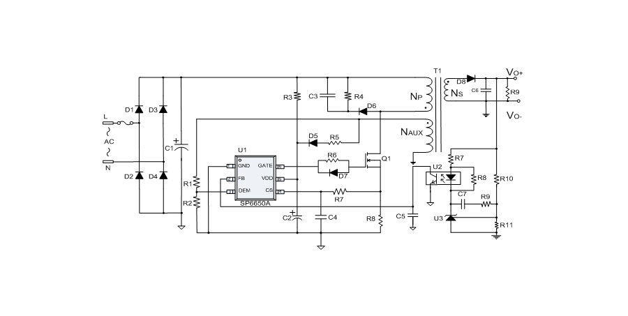 SP6650A是一顆高性能、多工作模式的PWM控制芯片。芯片可以工作在跳頻及綠色模式,以此來(lái)減小空載和輕載時(shí)的損耗,也可以工作在QR工作模式及CCM工作模式,提高整機(jī)的工作效率。SP6650A在啟動(dòng)和工作時(shí)只需要很小的電流,可以在啟動(dòng)電路中使用一個(gè)很大的電阻,以此來(lái)進(jìn)一步減小待機(jī)時(shí)的功耗。SP6650A內(nèi)置多種保護(hù),包括:輸入電壓過(guò)低保護(hù)(Brown-out),輸出電壓短路保護(hù),VDD過(guò)壓保護(hù)(OVP),VDD過(guò)壓箝位,VDD欠壓保護(hù)(UVLO),過(guò)溫保護(hù)(OTP)等。