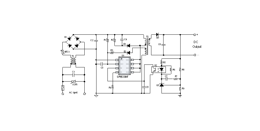 SP6638HF是一顆電流模式PWM控制芯片,內(nèi)置功率MOSFET,用于功率在18W以內(nèi)的方案。該芯片在系統(tǒng)輸出空載時(shí)工作在跳頻模式,在系統(tǒng)輸出輕載到中等負(fù)載階段工作在PFM模式,在輸出重載時(shí)工作在最大恒定工作頻率。SP6638HF的啟動電流和工作電流設(shè)定的比較小,以此減小待機(jī)時(shí)的功耗。芯片內(nèi)置有斜坡補(bǔ)償電路,避免次諧波振蕩的發(fā)生,改善系統(tǒng)的穩(wěn)定性。芯片內(nèi)置有前沿消隱時(shí)間(Leading-edge blanking time),消除緩沖網(wǎng)絡(luò)中的二極管反向恢復(fù)電流對電路的影響。該芯片帶有抖頻功能,能夠有效改善系統(tǒng)的EMI性能。芯片最低的工作頻率設(shè)置在音頻以上,在工作時(shí)可以避免系統(tǒng)產(chǎn)生噪音。SP6638HF內(nèi)置多種保護(hù),包括逐周期限流保護(hù)(OCP),過壓保護(hù)(OVP),VDD過壓箝位,欠壓保護(hù)(UVLO),過溫保護(hù)(OTP)等,通過內(nèi)部的圖騰柱驅(qū)動結(jié)構(gòu)可以更好的改善系統(tǒng)的EMI特性和開關(guān)的軟啟動控制。SP6638HF使用SOP8無鉛封裝。