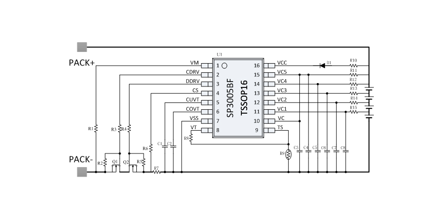 SP3005BF是一款用于5串鋰電池的保護芯片,SP3005BF內部集成了高精度的電壓、電流檢測電路,能夠實現(xiàn)每串電池的過壓、欠壓保護,以及整串電池的充電過流、放電過流、短路保護和充放電的溫度保護等。SP3005BF內部集成N型MOSFET的驅動電路,能夠直接驅動外部N型充電管和放電管。