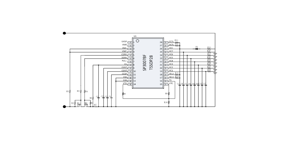 SP3007BF是一款用于6-7串鋰電池的保護(hù)芯片,SP3007BF 內(nèi)部集成了高精度的電壓、電流檢測(cè)電路,能夠?qū)崿F(xiàn)每串電池的過(guò)壓、欠壓保護(hù),以及整串電池的充電過(guò)流、放電過(guò)流、短路保護(hù)和充放電的溫度保護(hù)等。SP3007BF 內(nèi)部集成 N型 MOSFET 的驅(qū)動(dòng)電路,能夠直接驅(qū)動(dòng)外部 N 型充電管和放電管,既可以兼容充放電分口應(yīng)用,也可以兼容充放電同口應(yīng)用。