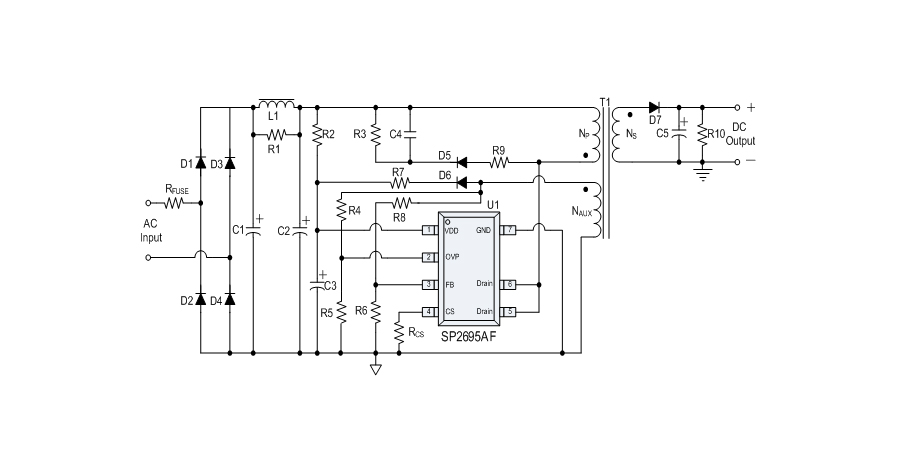 SP2695AF offers comprehensive protection coverage with auto-recovery feature including Cycle-by-Cycle current limiting, VDD over voltage protection (OVP), FB over voltage protection, load short circuit protection, VDD under voltage lockout (UVLO), Output OVP, Output UVP, OTP etc.